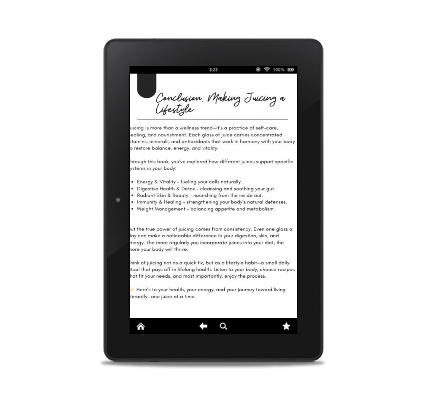 Each recipe includes step-by-step instructions and highlights which part of the body it supports, making juicing not only simple—but deeply purposeful. Whether you’re new to juicing or looking to enhance your wellness routine, this book will help you unlock the healing power of fruits and vegetables.